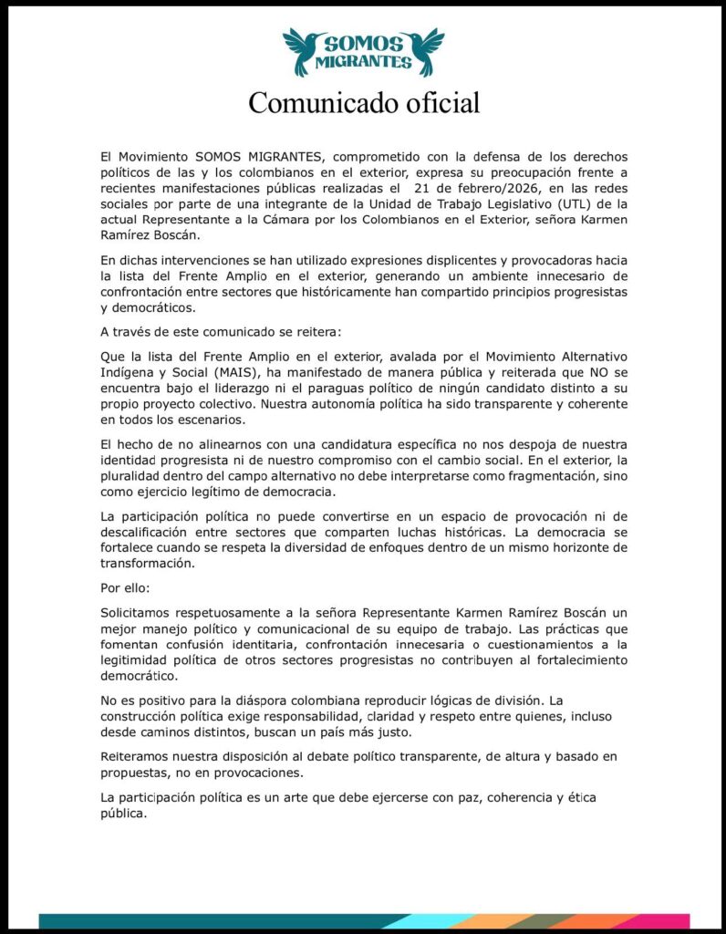 Comunicado del Movimiento Social y Político Somos Migrantes En relación con los hechos ocurridos el 6 de febrero de 2026 en el Consulado de Colombia en Valencia, hacemos un llamado a que este espacio, concebido como la casa de las y los colombianos en el exterior, garantice siempre el trato respetuoso y acorde con los derechos de la ciudadanía, apostando por el diálogo, la mejora institucional y la construcción colectiva de soluciones.