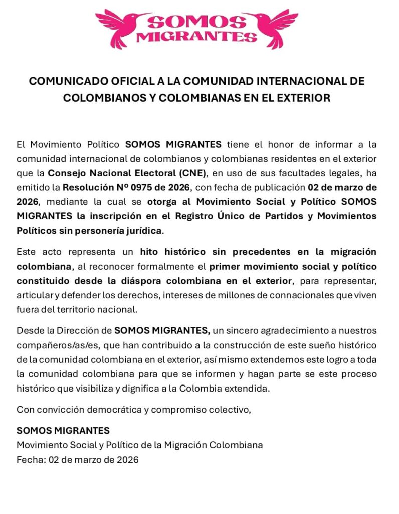 Me complace anunciar que el CNE da Resolucion al MOVIMIENTO SOMOS MIGRANTES, como Movimiento Social y Politico de Colombianos en el Exterior.